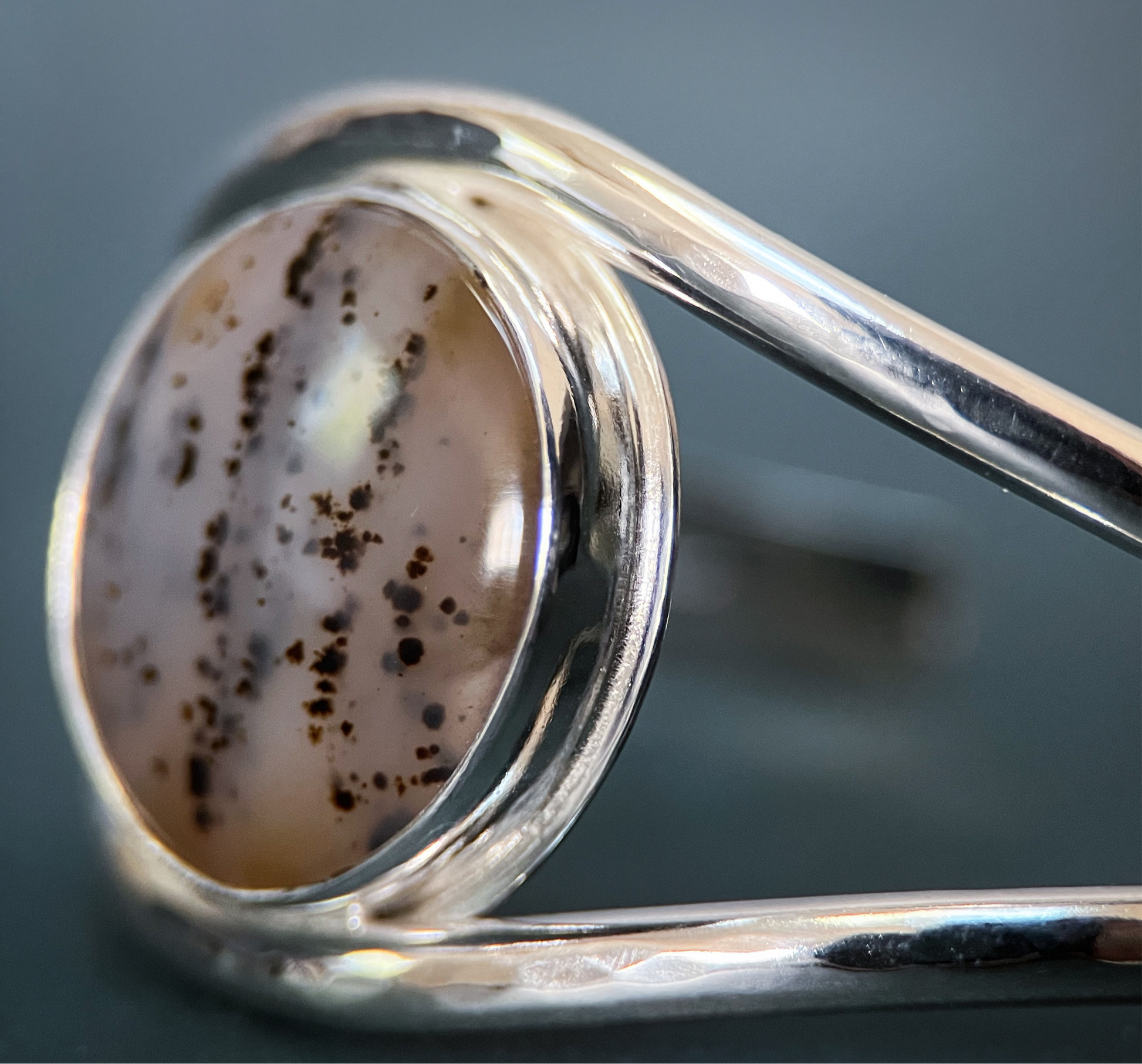 Cradled between two sweeping sterling bands, the open cuff design offers both structure and movement—like clouds wrapping a ridgeline. The hand-forged silver has a gentle shimmer that complements the agate’s quiet complexity, creating a piece that’s equally bold and serene. Finished to a size 6(M)