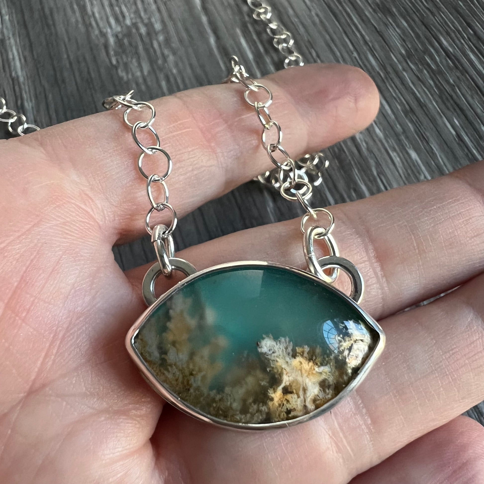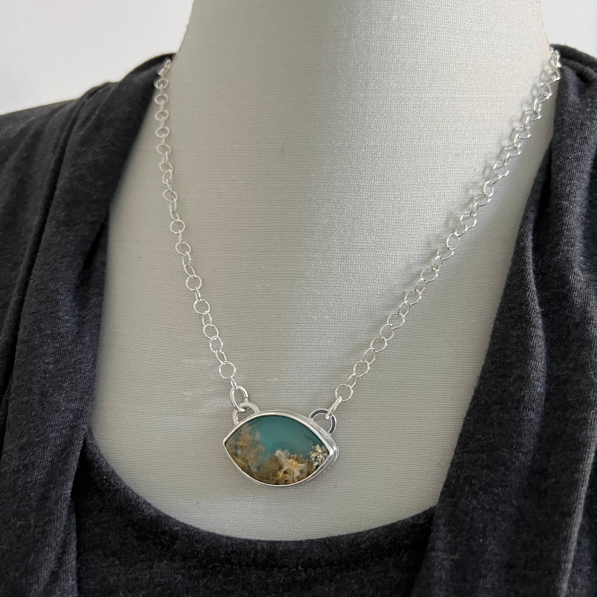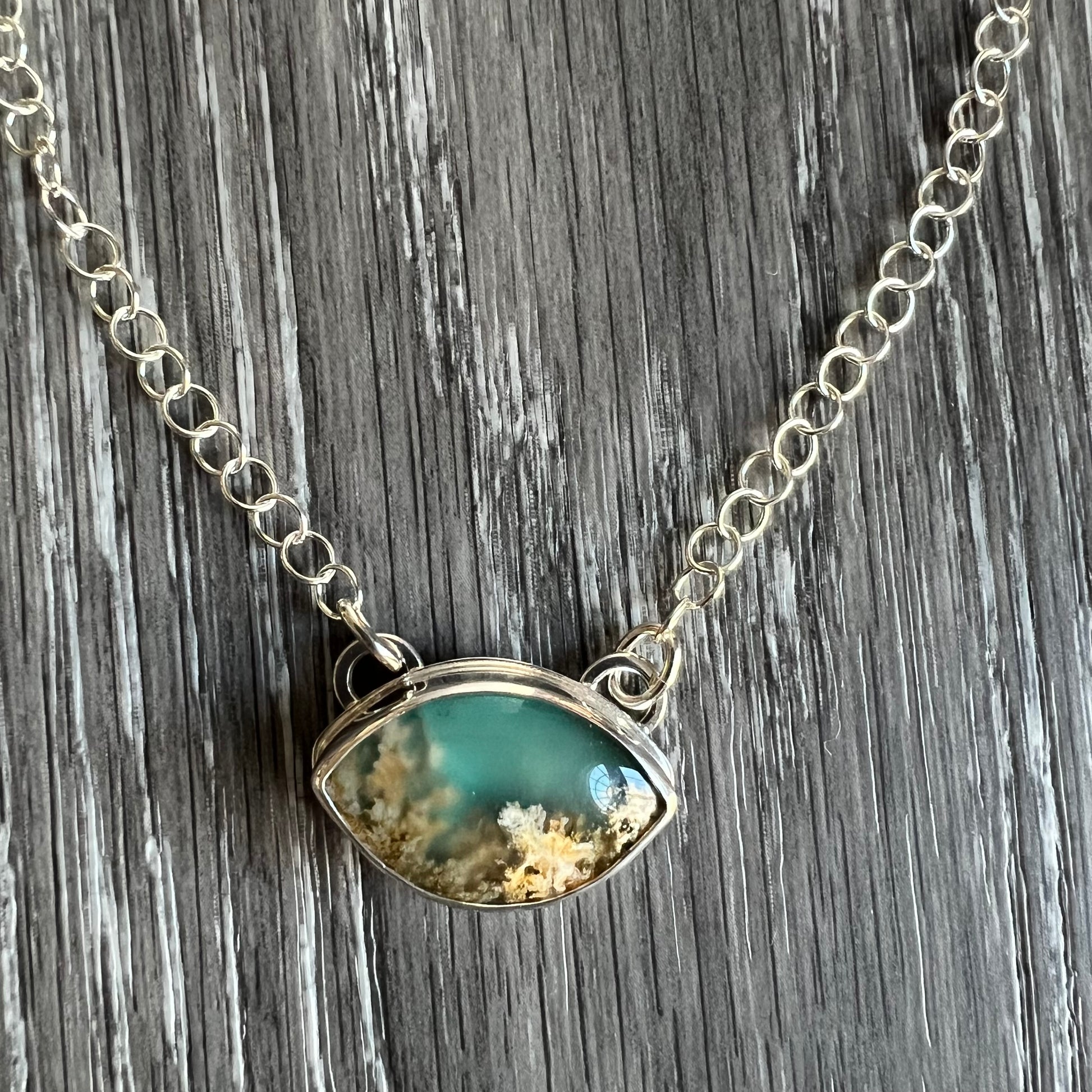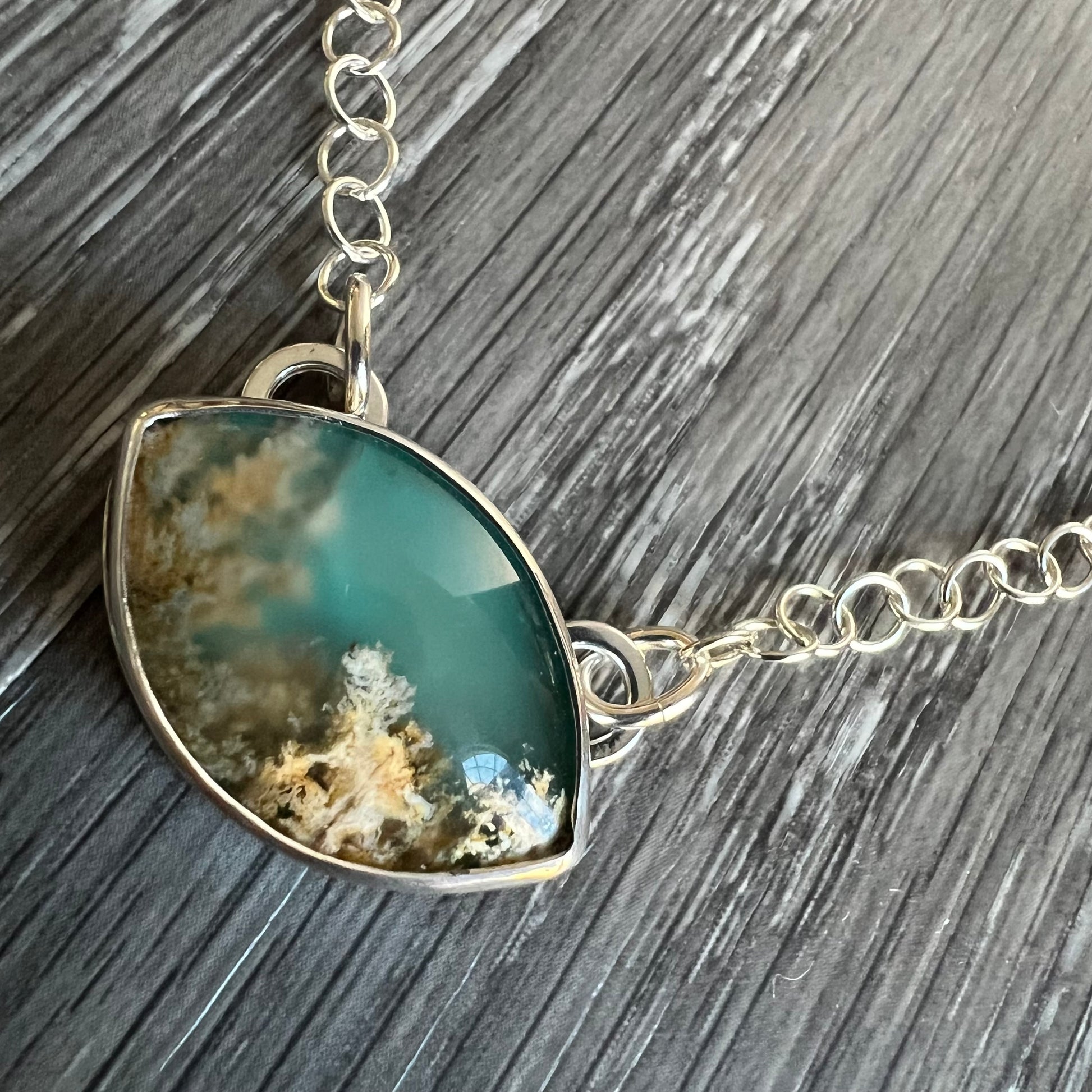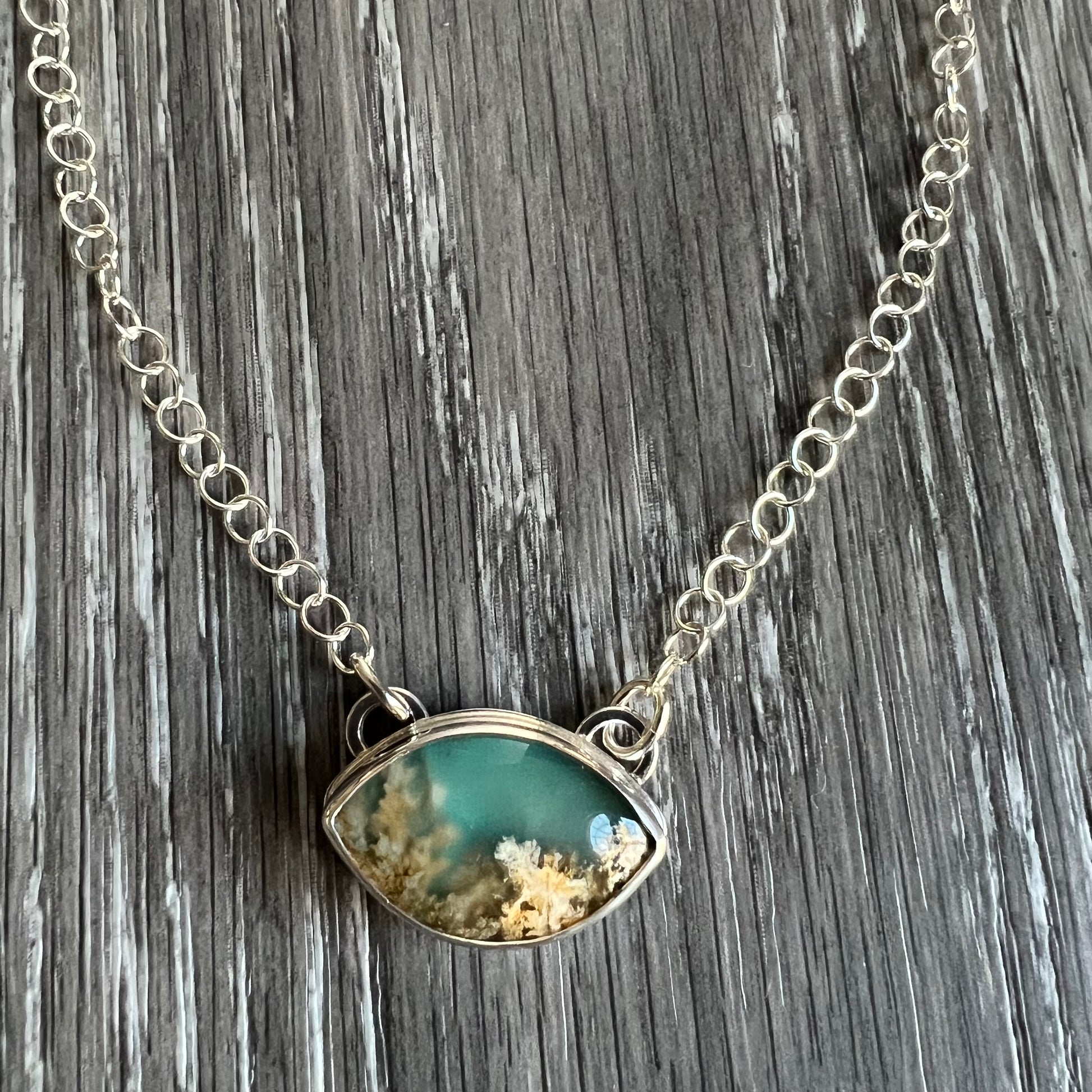 Immerse yourself in the beauty of the ocean with the Reef Necklace. Featuring a stunning plume agate doublet, this piece evokes the delicate beauty of coral reefs suspended in time. Its natural inclusions and tranquil aqua tones are encased in a sterling silver bezel setting, paired with a classic round cable chain.