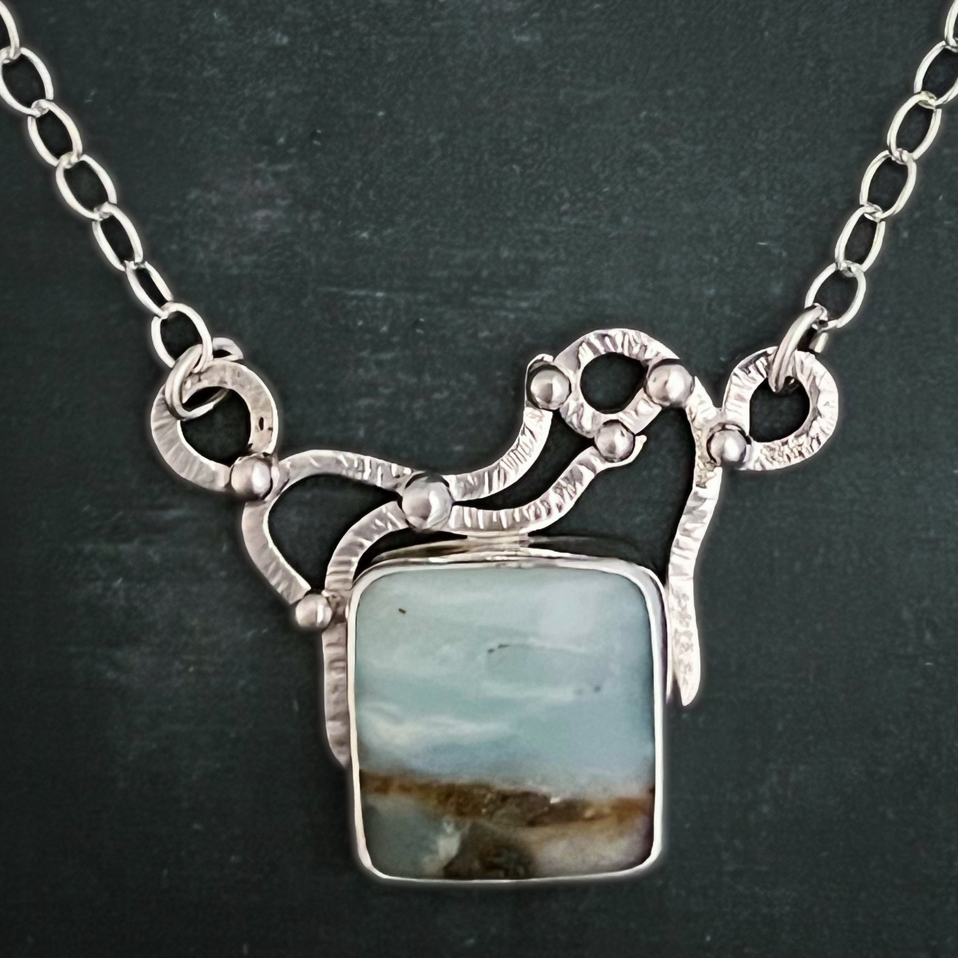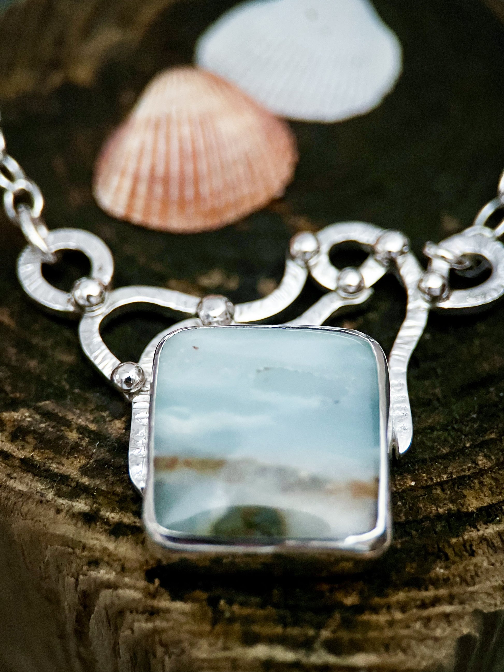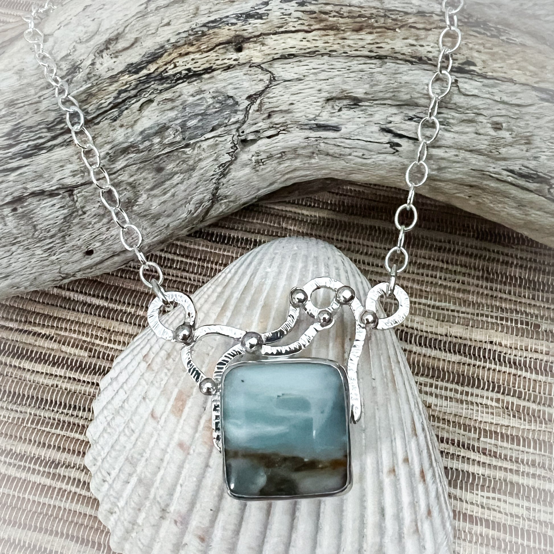 The Tidepool Necklace blends natural beauty with artisan silverwork. A genuine opalized wood gemstone displays soft layers of seafoam blue and earthy tones, reminiscent of water meeting the shore. The stone is bezel set in sterling silver and framed with organic, hand-forged silver work that ripples like water across the tidepoolās surface.