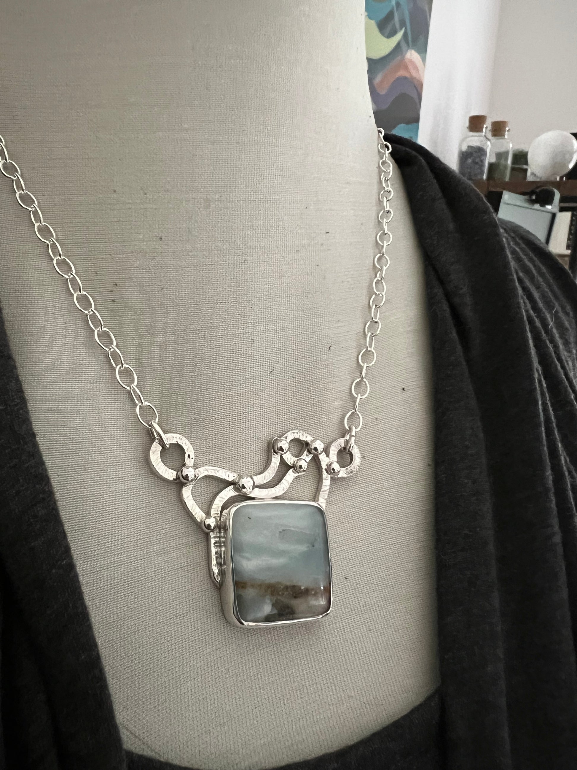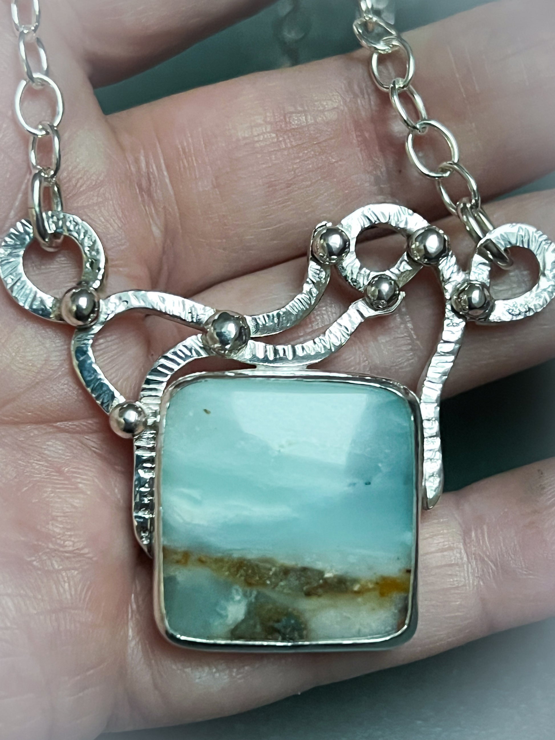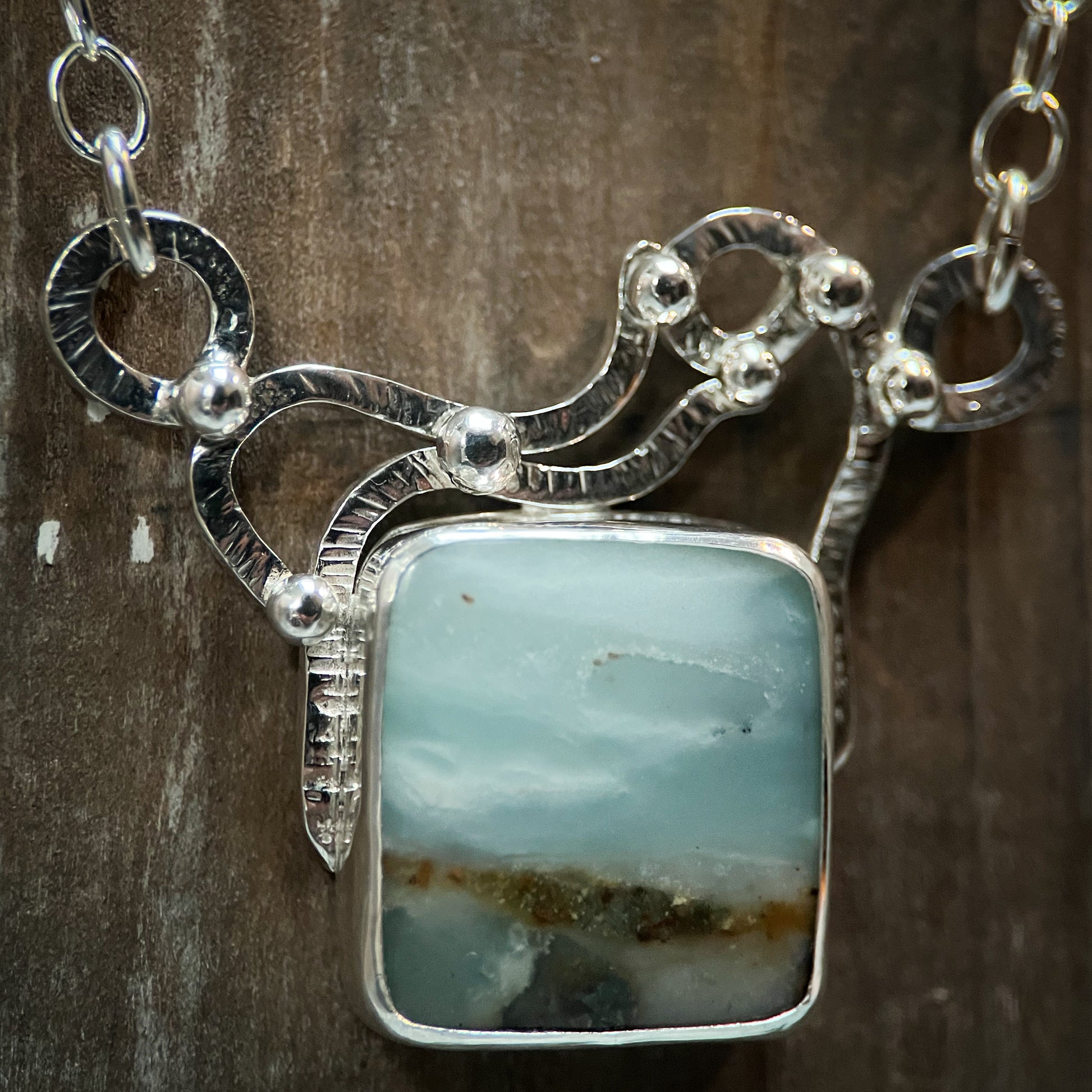 The Tidepool Necklace blends natural beauty with artisan silverwork. A genuine opalized wood gemstone displays soft layers of seafoam blue and earthy tones, reminiscent of water meeting the shore. The stone is bezel set in sterling silver and framed with organic, hand-forged silver work that ripples like water across the tidepoolās surface.