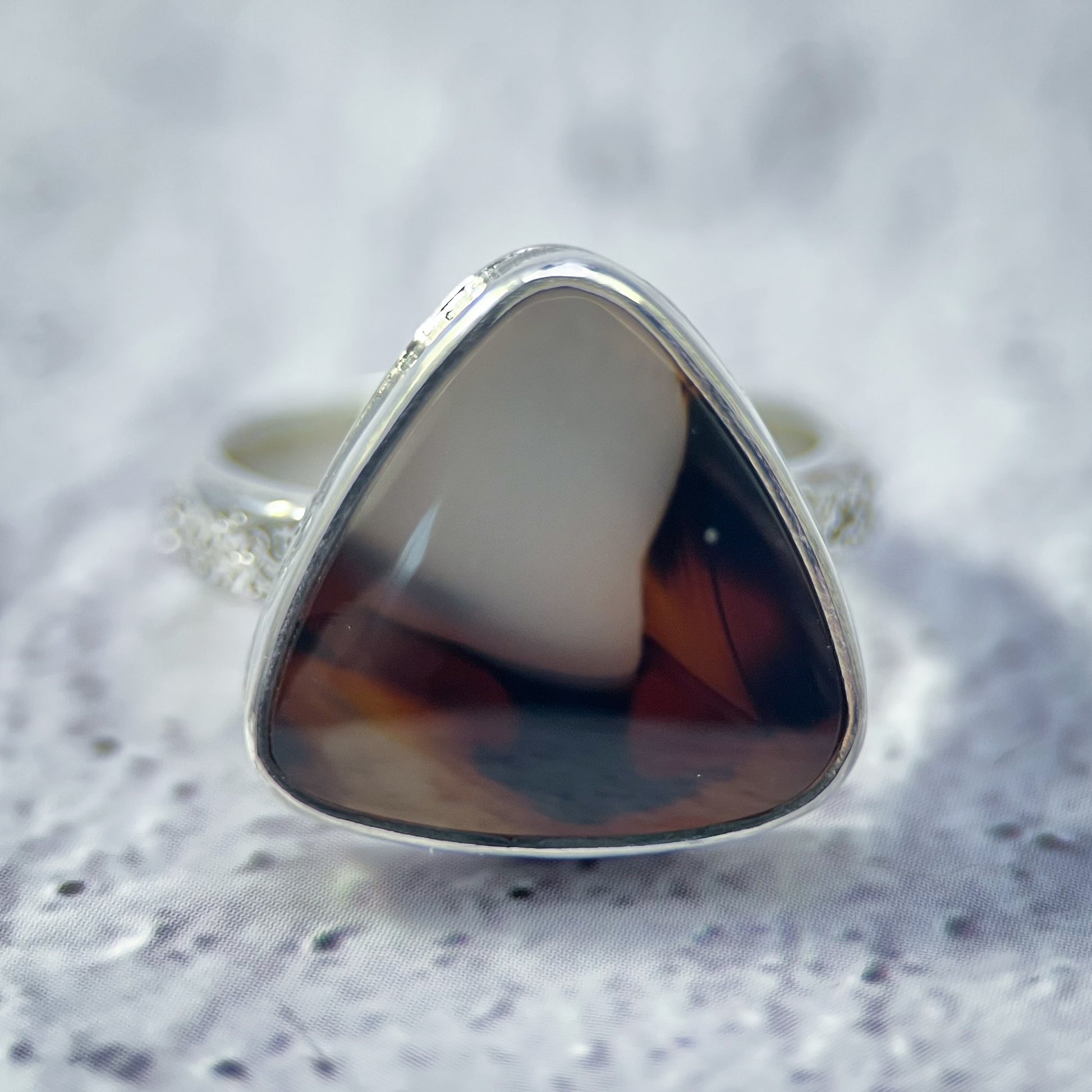 Embercrest Ring – Montana Agate Sterling Silver Textured Band (Size 8)
