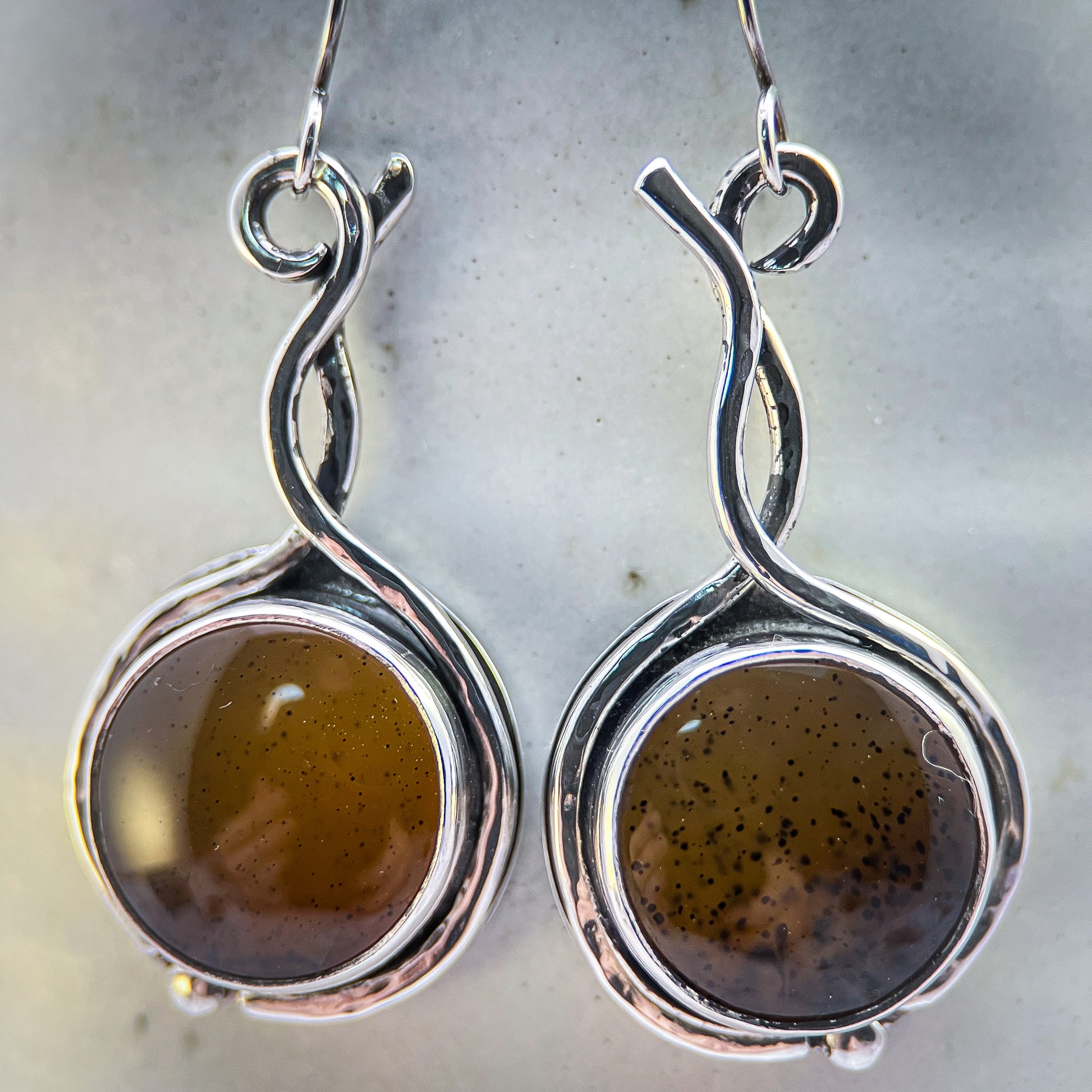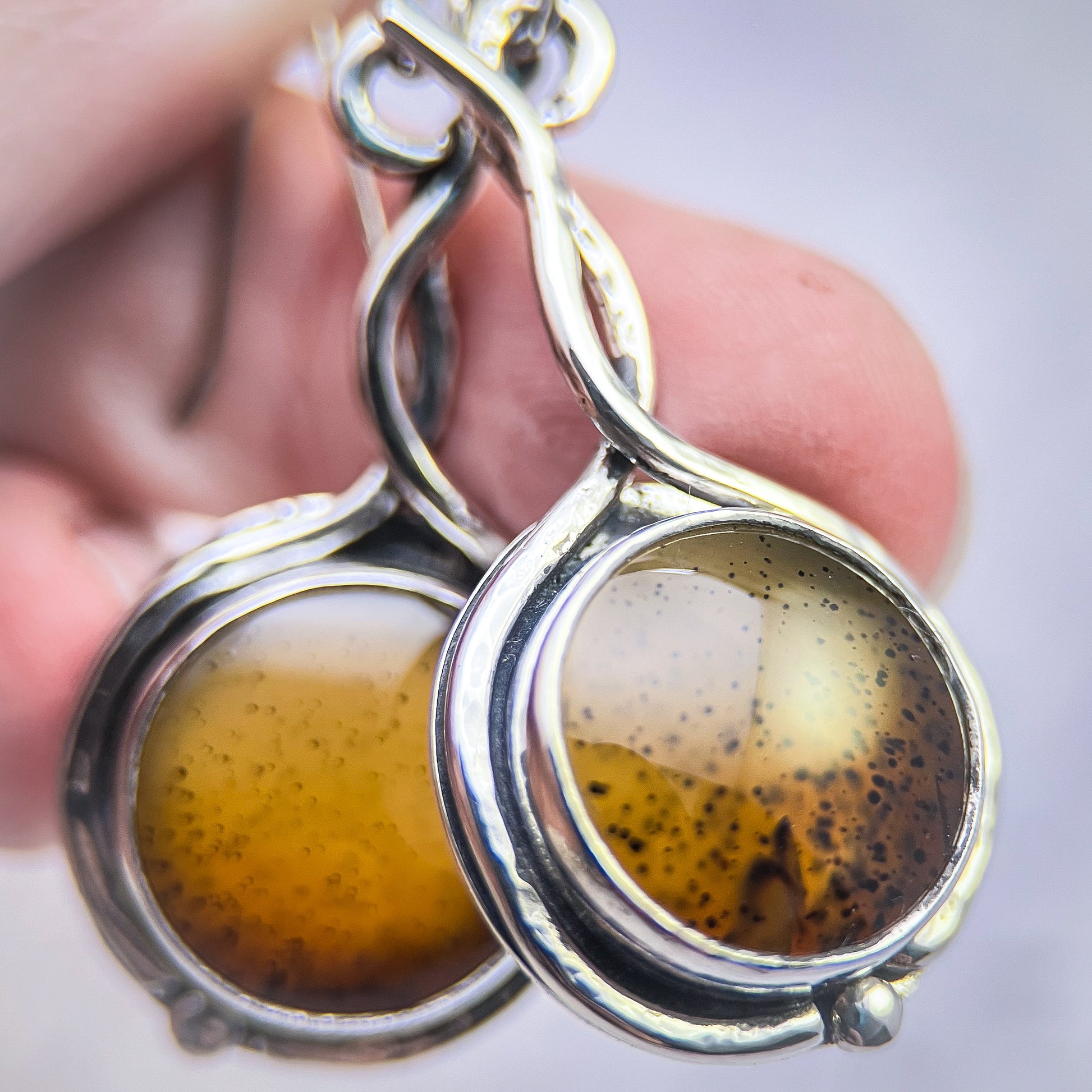 Where natureās curves meet artisan silverwork, the Wandering Branch Earrings come to life. These one-of-a-kind earrings feature round Montana agatesātranslucent golden-brown stones flecked with natural inclusions that resemble lichen, moss, or specks of mountain soil.